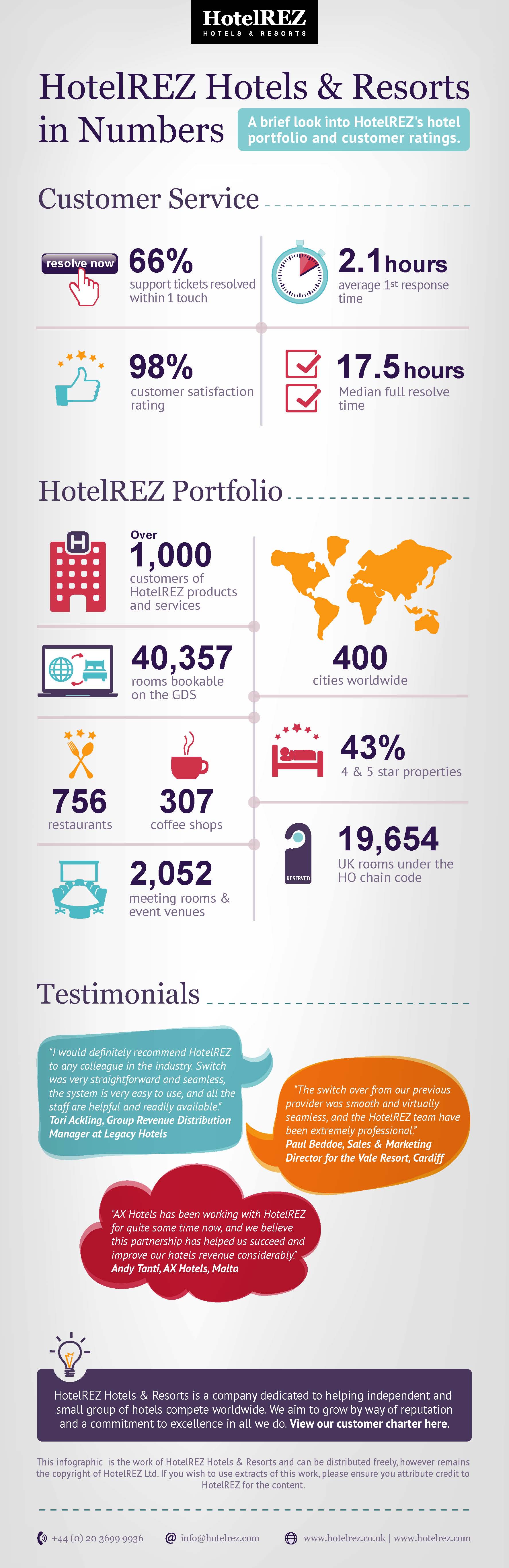 To commemorate 2015’s top marks, a new infographic detailing the representation company’s portfolio over its 12 years of existence, alongside customer ratings and testimonials was produced. Among the hotel customers, Tori Ackling, Group Revenue Distribution Manager at Legacy Hotels, explains why the UK group has been a long time HotelREZ customer: