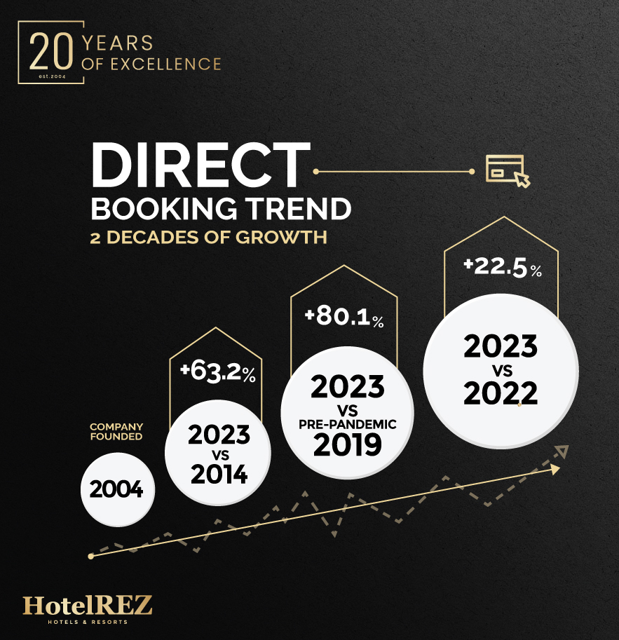 HotelREZ Hotels & Resorts also found Direct Booking (popular with hoteliers for its attractive cost of sale and ownership of the customer) continues to experience high growth rates – up 22.5% in 2023 vs 2022, and strengthening by 80.2% against its pre-pandemic standing. For HotelREZ clients, Direct Booking on mobiles has more than doubled since 2019 – up from 15% of all direct bookings to 32% in 2023.